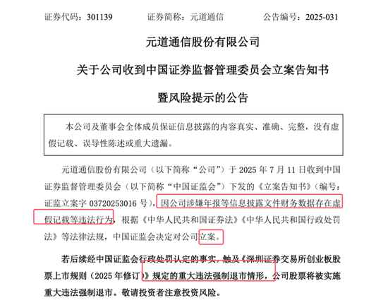 上市刚刚 3 年,元道通信公告,元道通信于 2025 年 7 月 11 日收到中国证券监督管理委员会下发的《立案告知书》(编号:证监立案字 03720253016 号),因公司涉嫌年报等信息披露文件财务数据存在虚假记载等违法行为,根据《中华人民共和国证券法》《中华人民共和国行政处罚法》等法律法规,中国证监会决定对公司立案。