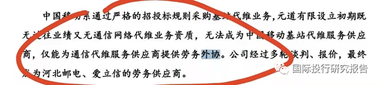 元道通信是中国移动和中国电信的业务外包公司(通信网络维护与优化、通信网络建设),奇妙的是,IPO说明书显示,元道通信对于很多业务会再通过外包劳务的方式把业务承包给其他人力资源公司(违背劳动法吗?),也是就是说,到凌通社家里来维修宽带的人不是移动公司的,连外包公司的人都不是,那个人虽然穿着移动的衣服,实际上却就是个人力资源公司雇来的临时农民工(穿着美团衣服送外卖的不是美团的人,穿着移动衣服来维修的不是移动的人,他们有一个共同的名字:农民临时工)。